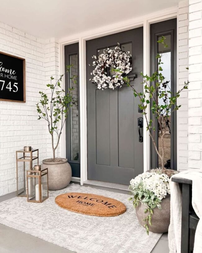 Potted plants and coordinating lanterns enhance the overall display, making your entrance feel welcoming and festive.