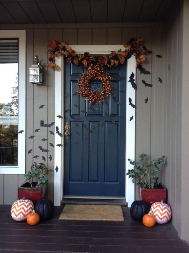 Unique pumpkin shapes and strategically placed bat accents shift an ordinary doorway into a stunning seasonal statement.