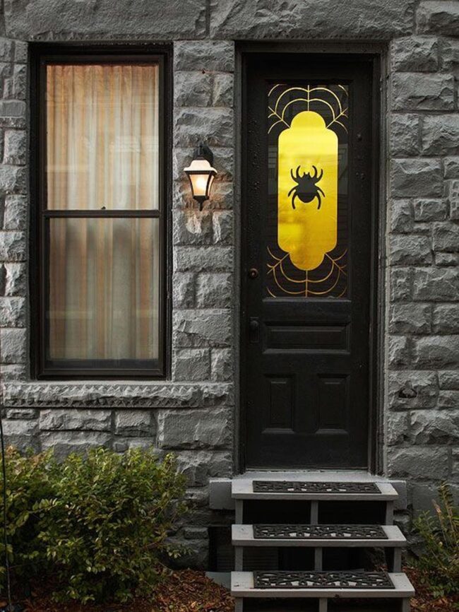 Halloween magic springs to life with a massive black spider dramatically perched against a bright yellow glass door panel, instantly capturing your imagination.