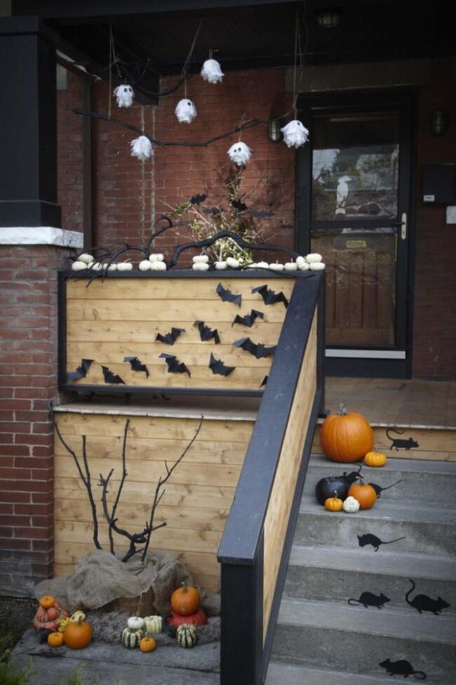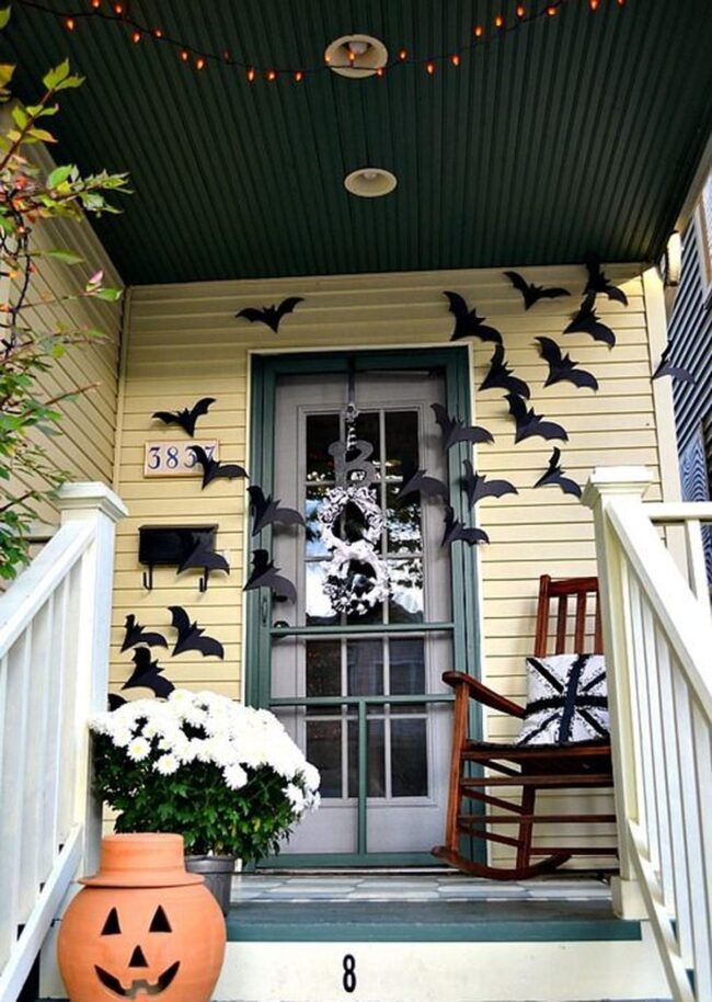 Black paper bats swoop gracefully across wooden railings, adding a whimsical touch that whispers Halloween without overwhelming your space.