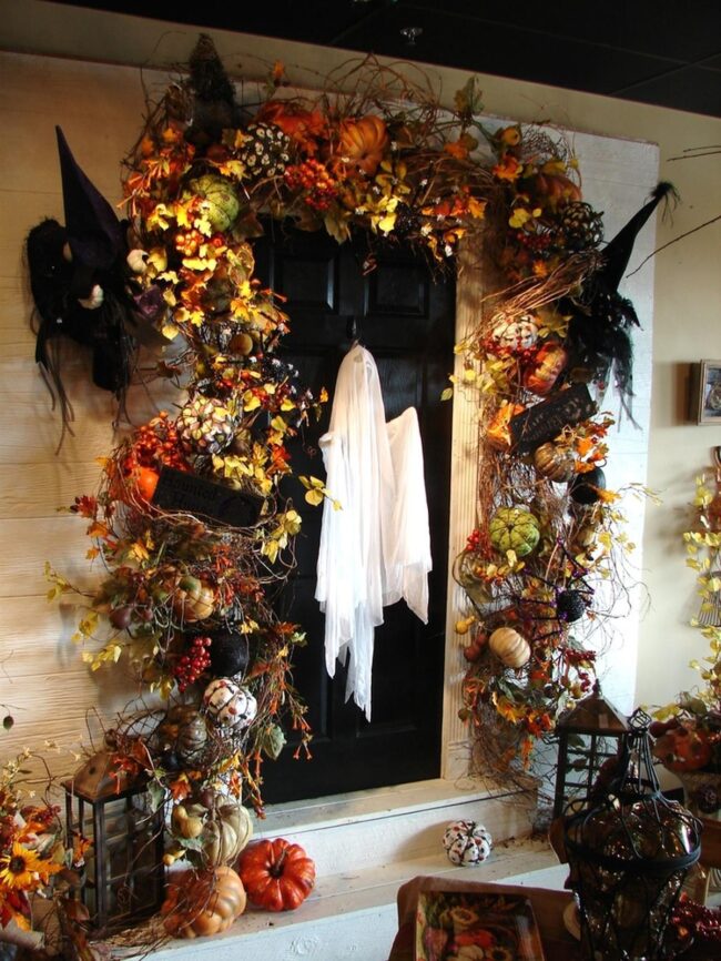 Orange and white pumpkins cascade near the entrance, creating a stunning seasonal display that catches every eye.