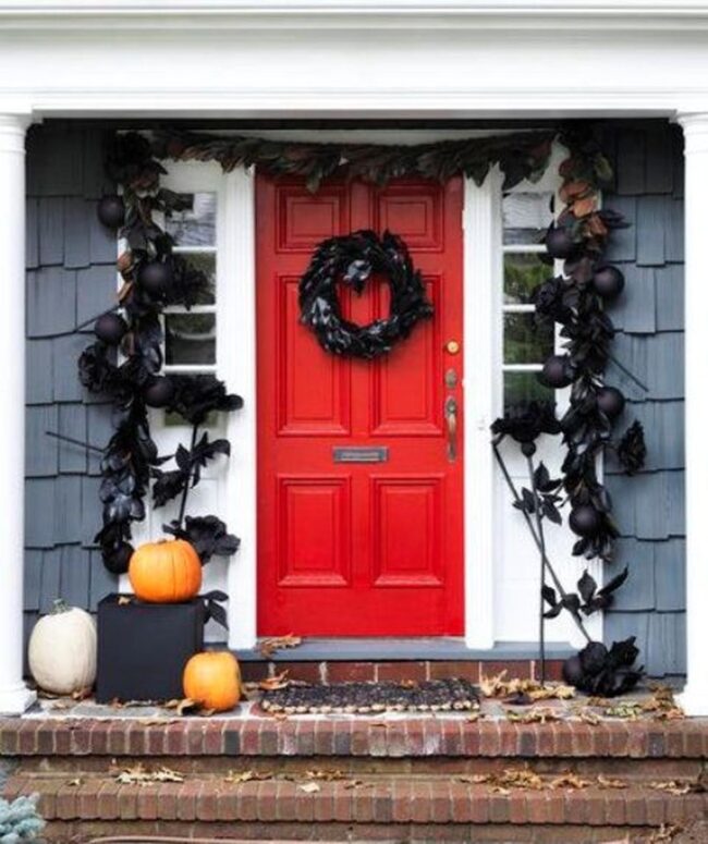 Your front door becomes a magnetic Halloween haven when deep black paint sets a dramatic stage for festive decorations.