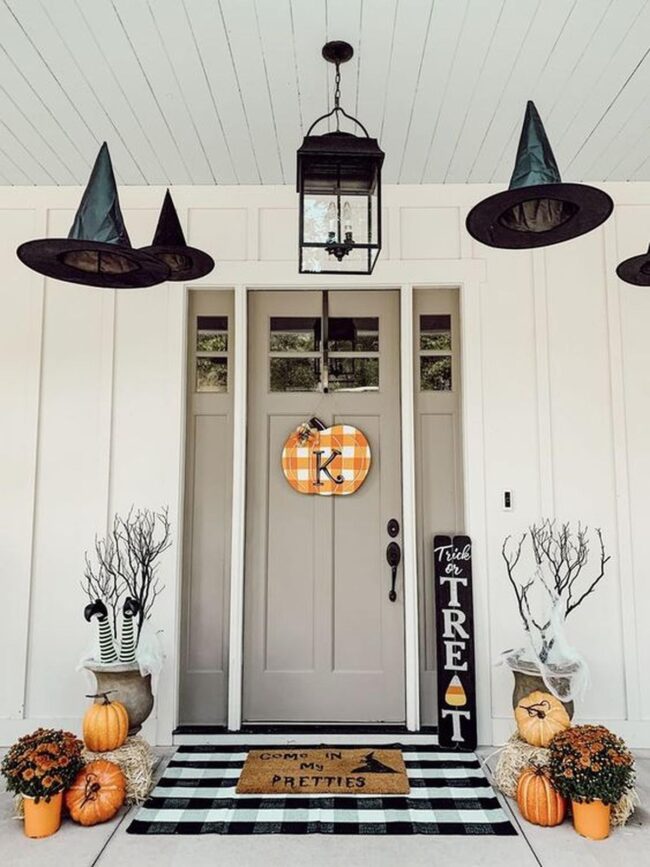 A cheeky "WITCH PLEASE" doormat brings instant personality and humor to the space, making visitors smile before they even step inside.