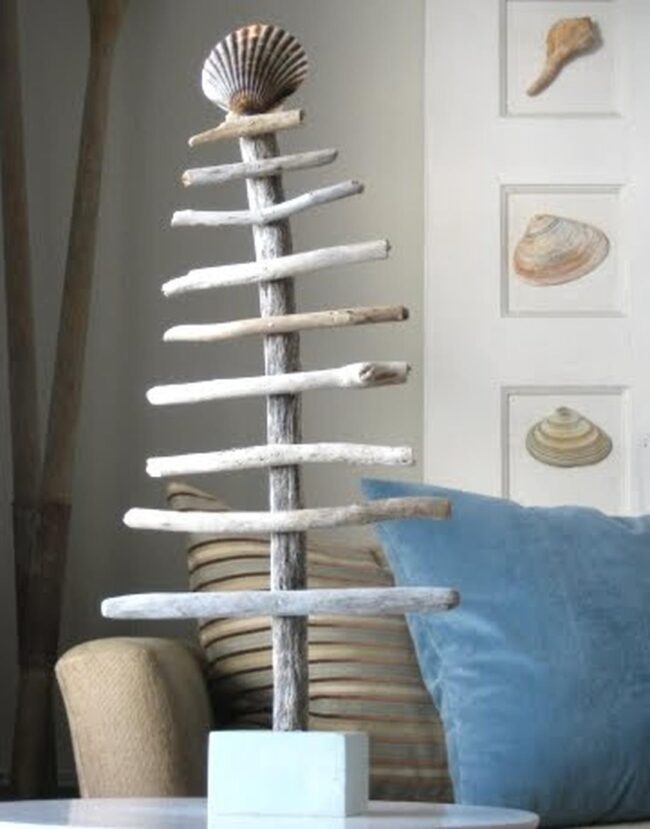 Coastal Christmas magic springs to life with driftwood trees that whisper ocean stories through every carefully placed wooden fragment.