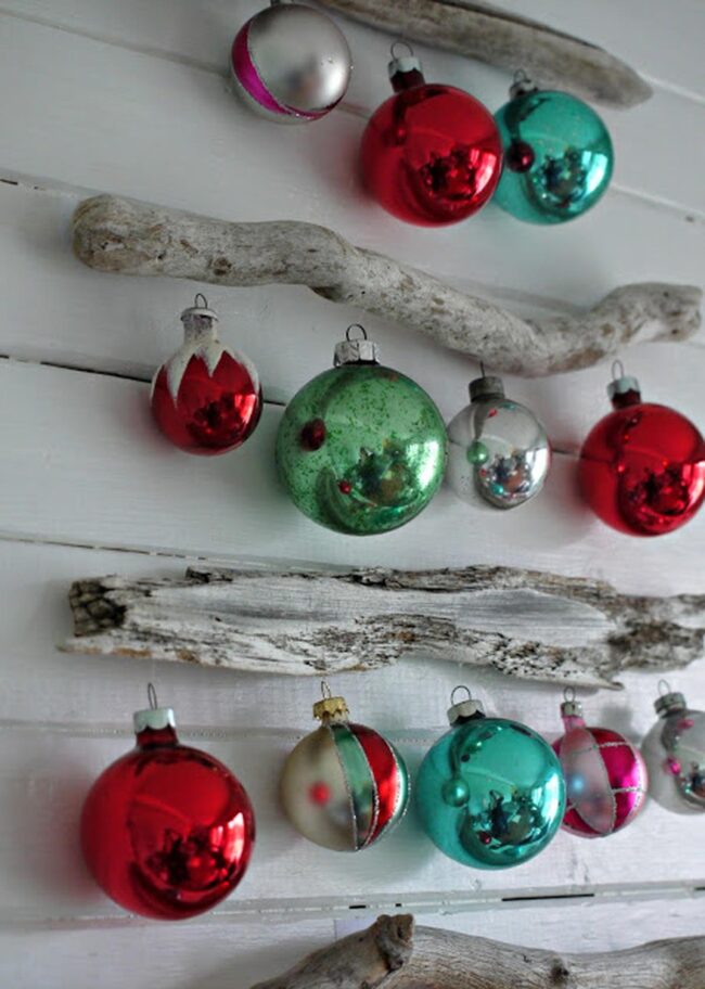 Weathered wooden planks become perfect backdrops for shiny glass ornaments that dance with light and color, creating eye-catching displays that feel both natural and festive.
