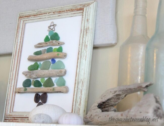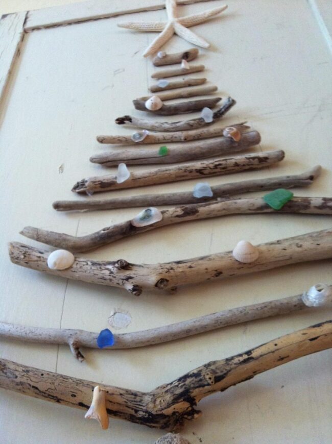 Coastal charm bursts through driftwood Christmas tree art, where sea treasures dance together in harmony.