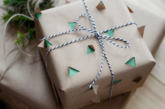 Kraft paper becomes your canvas for expressing personal style, with delicate triangle cutouts adding whimsical charm to each package.
