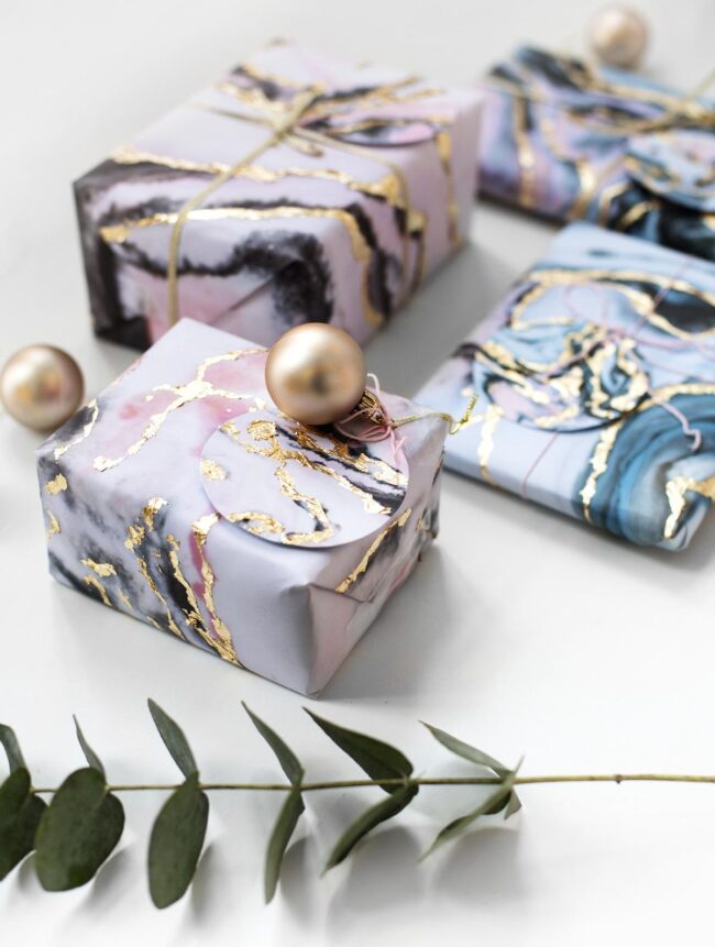 Marble gift wrapping dazzles with swirling color combinations that instantly grab your eye and make packages pop like magical art pieces.