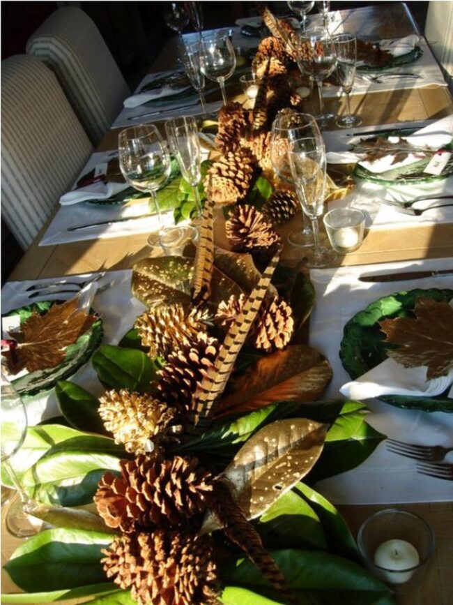 Scattered brown leaves across the tablecloth bring outdoor woodland magic directly into your dining space, blending nature's beauty with indoor comfort.