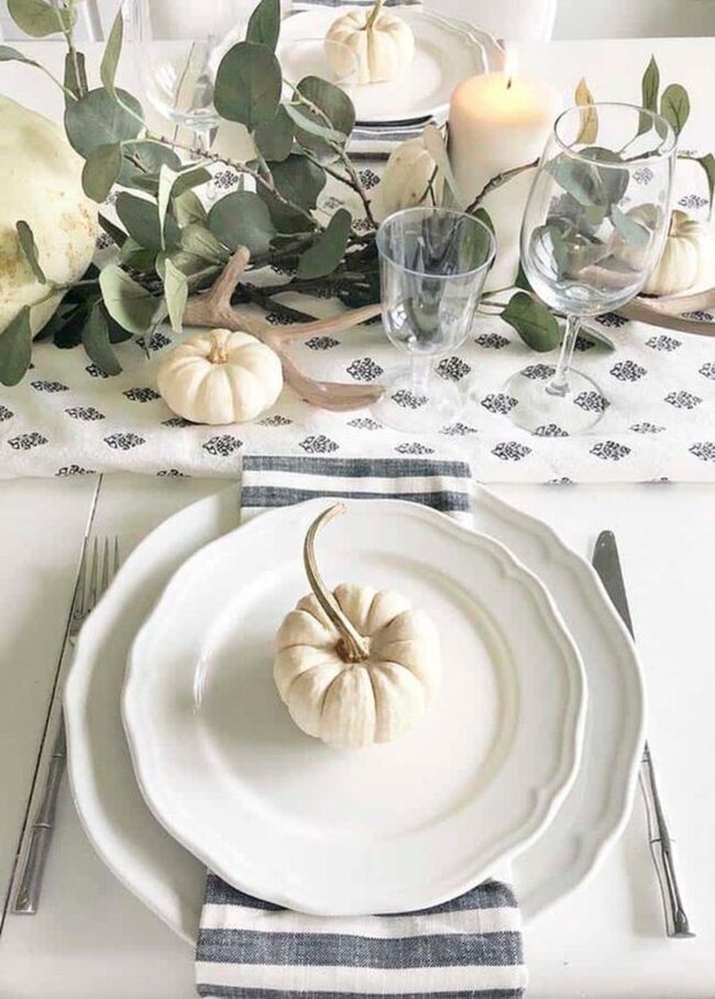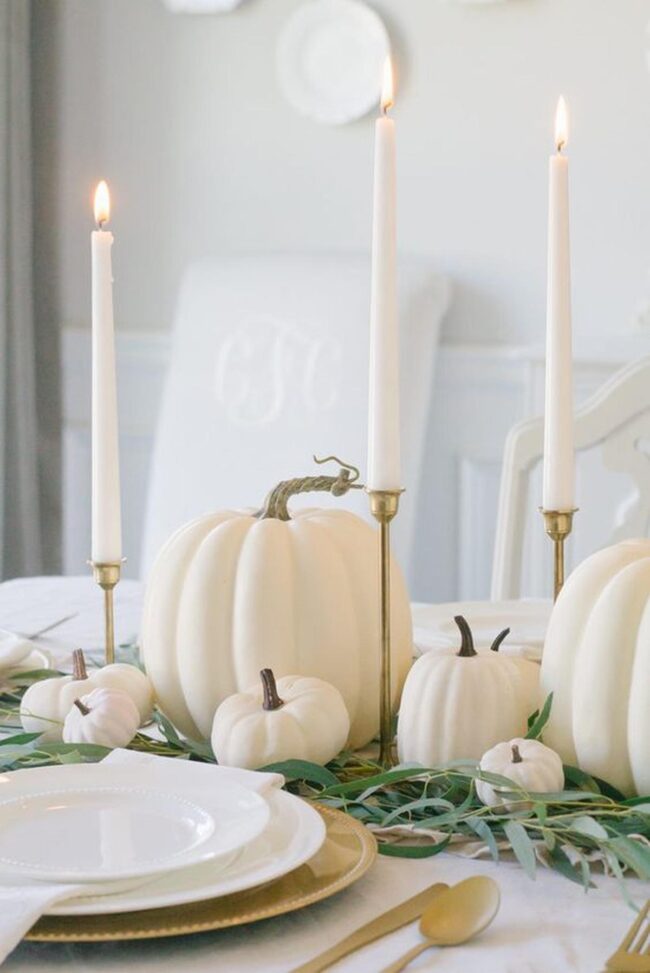 Delicate white pumpkins nestle as centerpieces, introducing natural charm without overwhelming the refined scene.