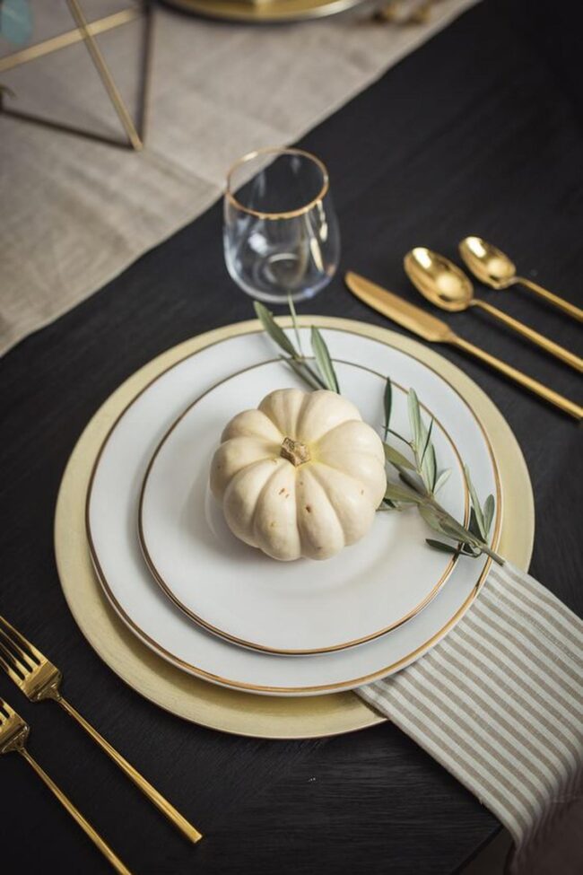 Small unexpected touches like a petite cream-colored pumpkin nestled beside each place setting whisper seasonal charm without shouting.