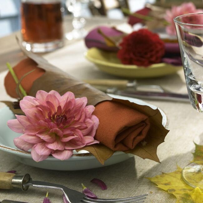 Fall's magic bursts through this inviting table setup, where orange napkins wrapped in crisp brown leaves whisper seasonal charm.