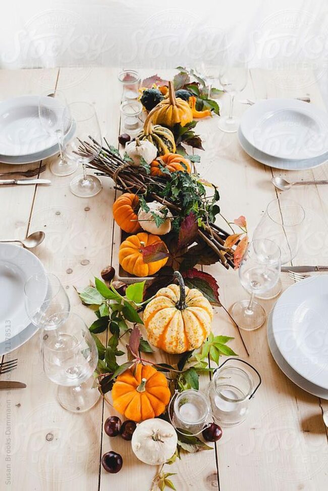 Pumpkins and dried leaves dance across the long white table, instantly captivating your senses with their rich, earthy colors.