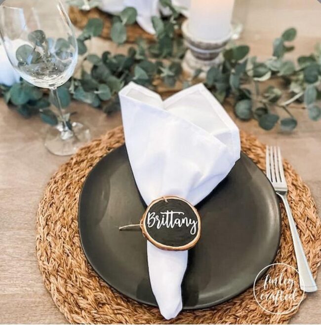 Wooden slice name tags add personal flair to crisp white napkins, creating instant conversation starters for guests.