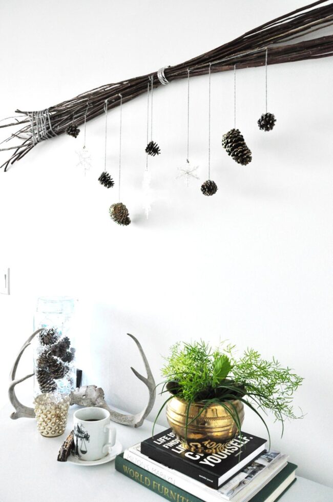 Delicate pine cones and silvery snowflakes cascade from slender branches, weaving woodland wonder across bare walls.