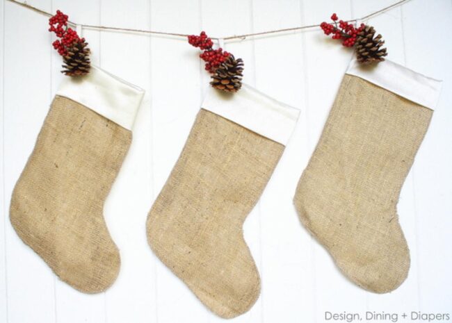 Charming pinecones and bright red berries peek playfully from stocking edges, creating visual interest without overwhelming your space.