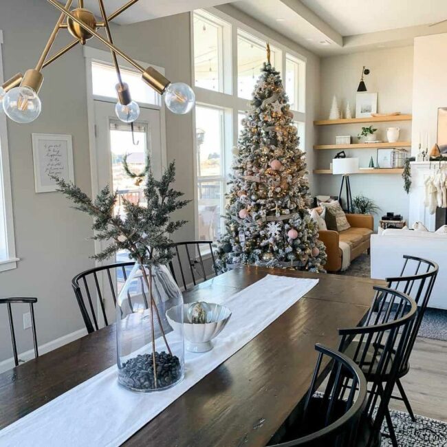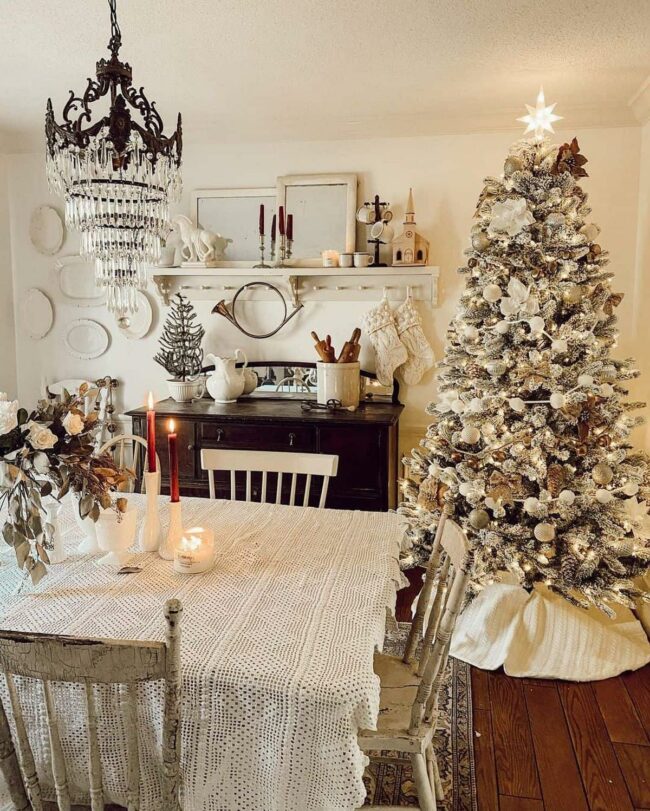 Silver and light blue ornaments cascade across a farmhouse Christmas tree, anchoring the dining room's magical holiday atmosphere.