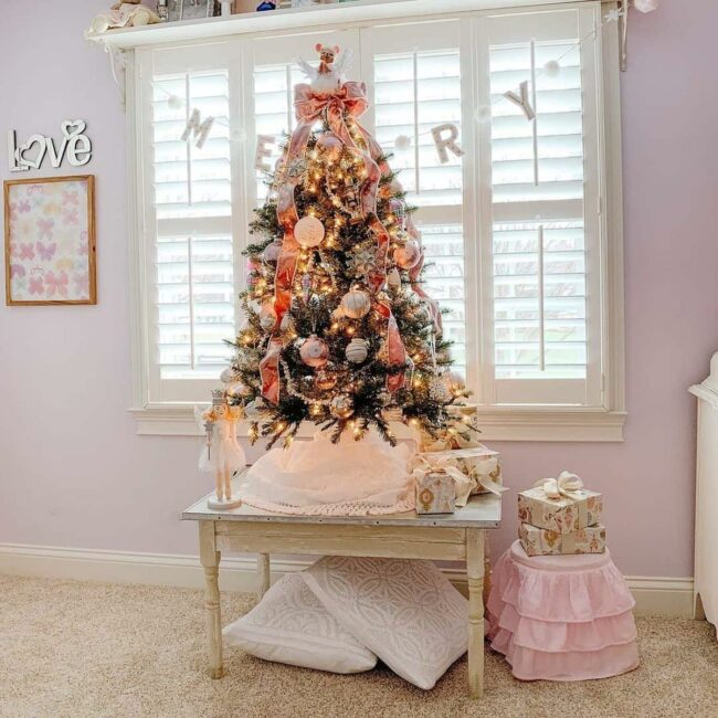 Magical Christmas spirit fills a girl's bedroom with a charming small tree perched on a two-toned wood table.