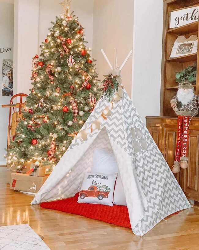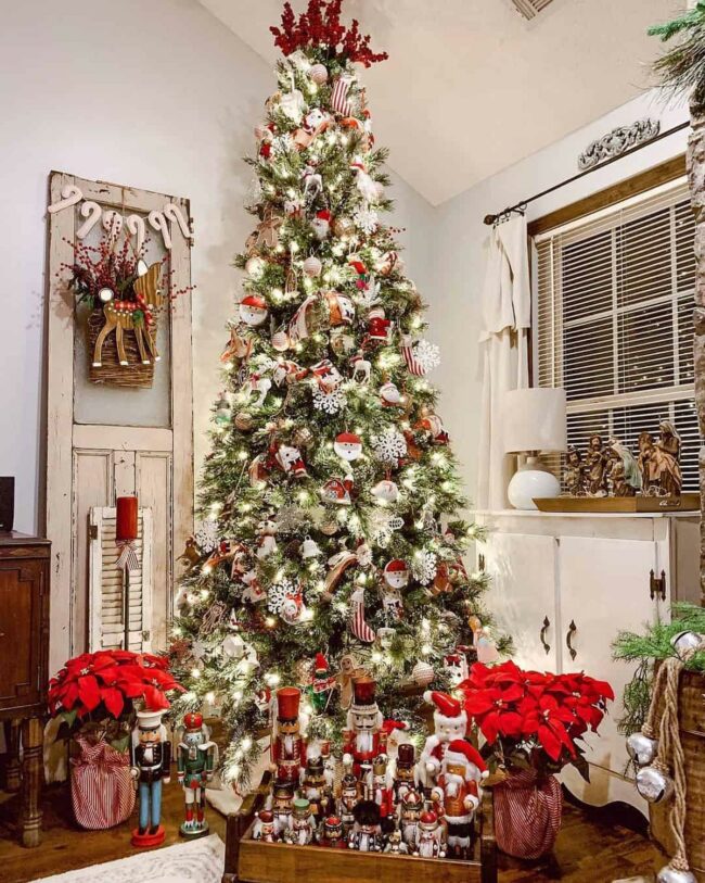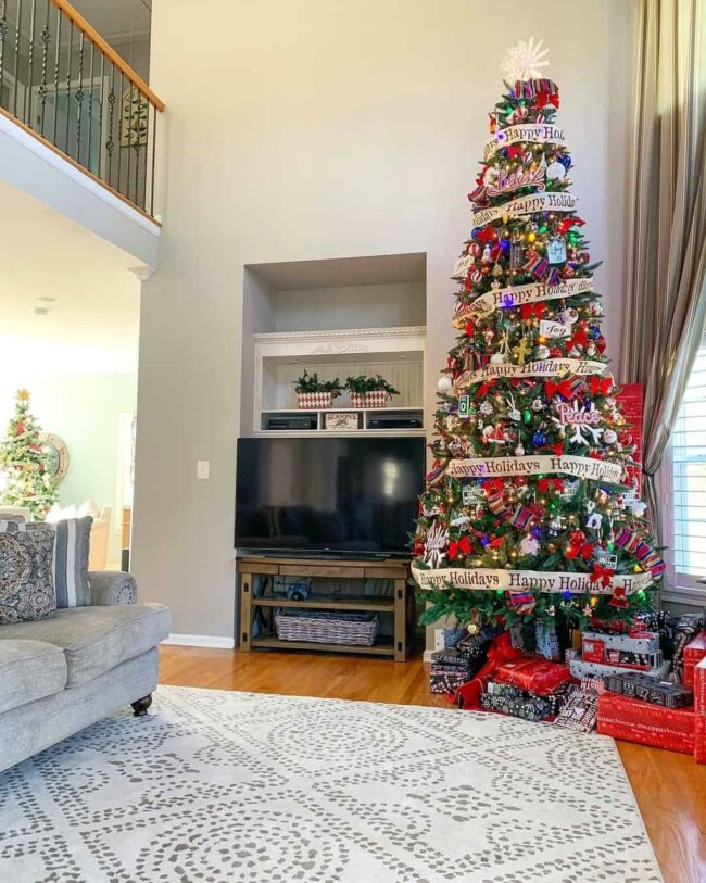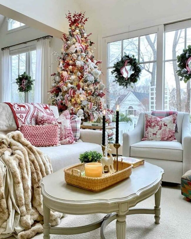 Red and white ornaments sparkle across the Christmas tree, radiating festive cheer throughout the room.