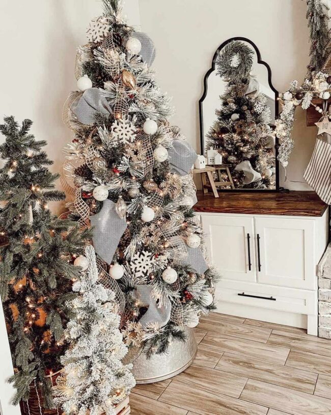 Silver ornaments dazzle on frosted Christmas trees, casting magical winter vibes across your space.