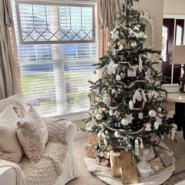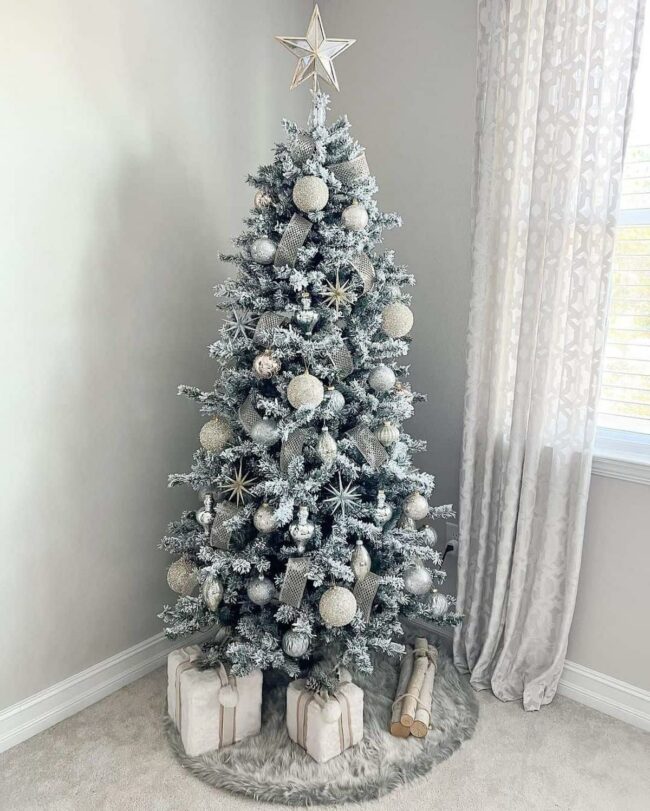 Sparkling white and silver ornaments crown a Christmas tree, instantly drawing eyes across the room with elegant simplicity.