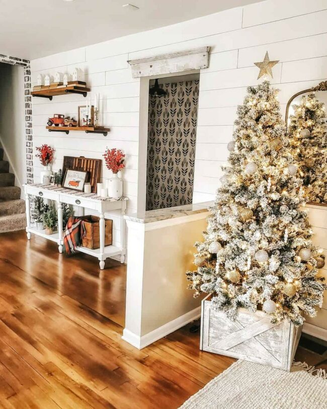 Pure white shiplap walls create an airy canvas that makes the tree stand out dramatically.