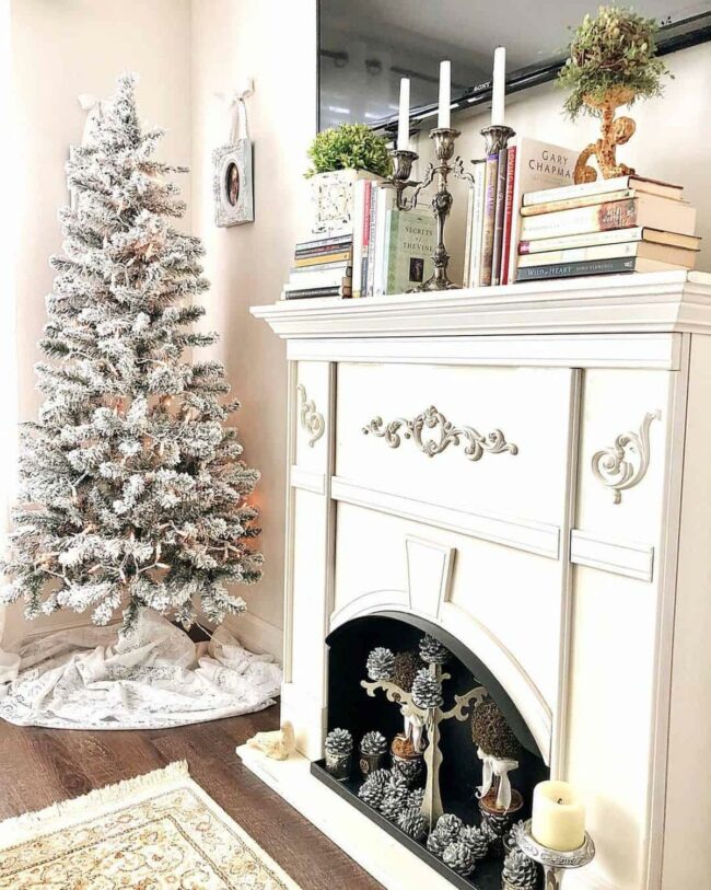 Atop the mantel, an antique candelabra rests beside stacked books, lending elegant depth to the festive display.