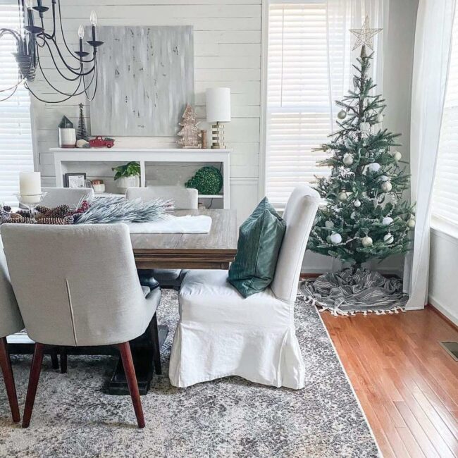 Farmhouse Christmas trees radiate holiday magic when placed strategically in dining room corners, casting elegant white and silver ornaments that shimmer with festive spirit.