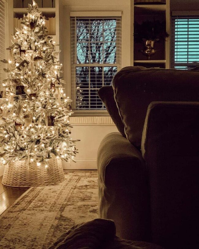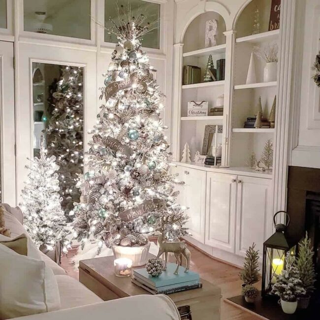 White-skirted frosted trees cast a festive spell across the room's warm landscape.