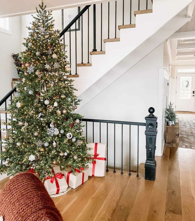 Black spindle railings frame the farmhouse-style tree, adding elegant rustic charm to the space.