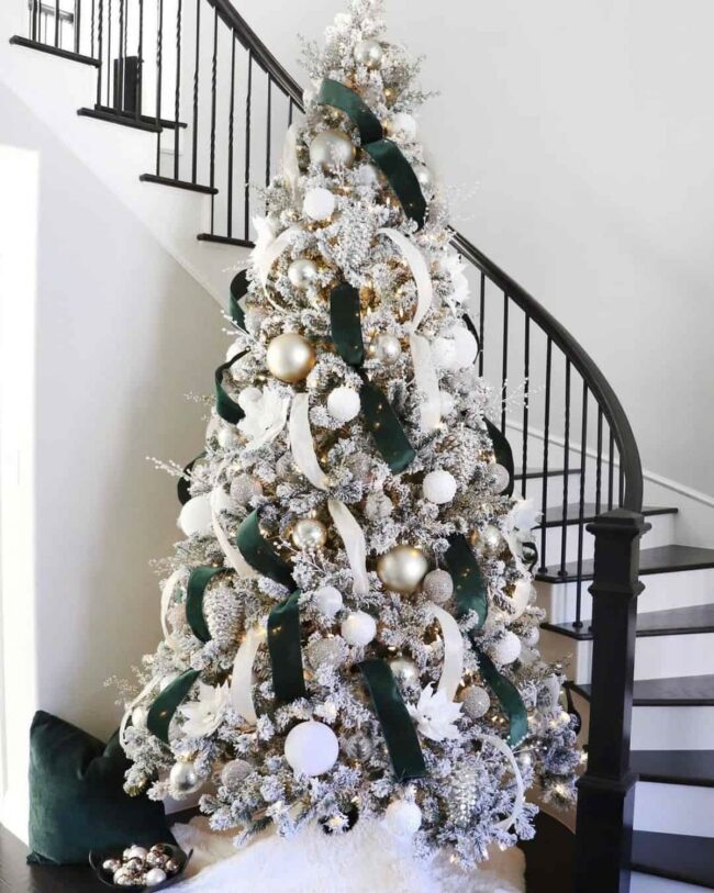 Magical flocked Christmas trees elevate holiday spaces with enchanting winter vibes, especially when nestled beneath dramatic curved staircases featuring contrasting black wood and white risers.