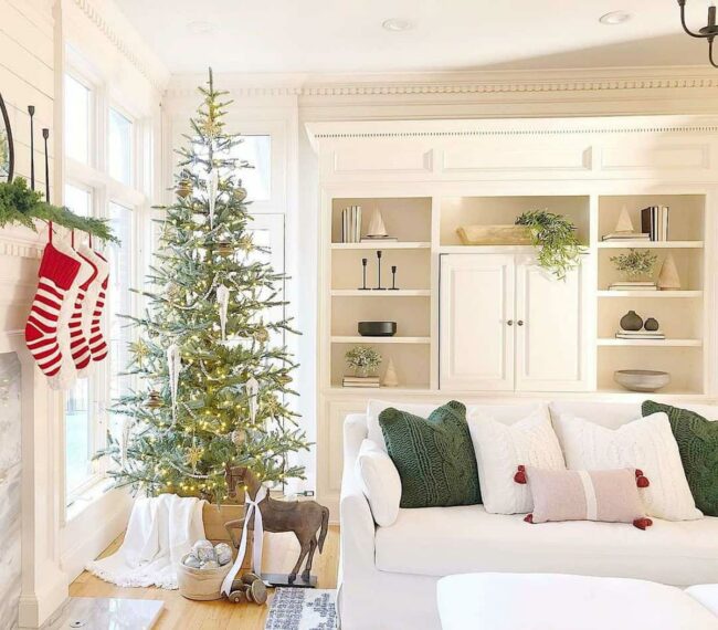 Nearby, a pristine white couch softens the scene with green and red throw pillows that inject playful holiday spirit.