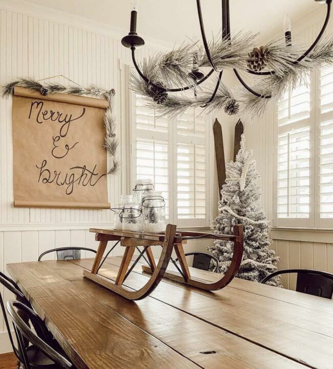 Rustic holiday charm radiates from a vintage wooden sleigh commanding center stage on the dining table.