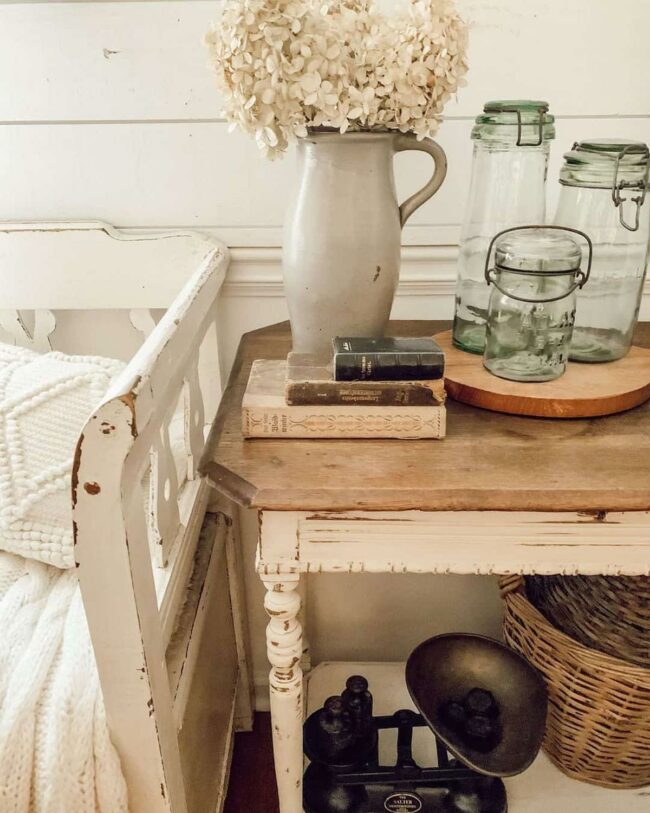 Stacked primer books rest on a vintage spindle console table beside a cozy white wood sleigh bed, beckoning you to relax and unwind.