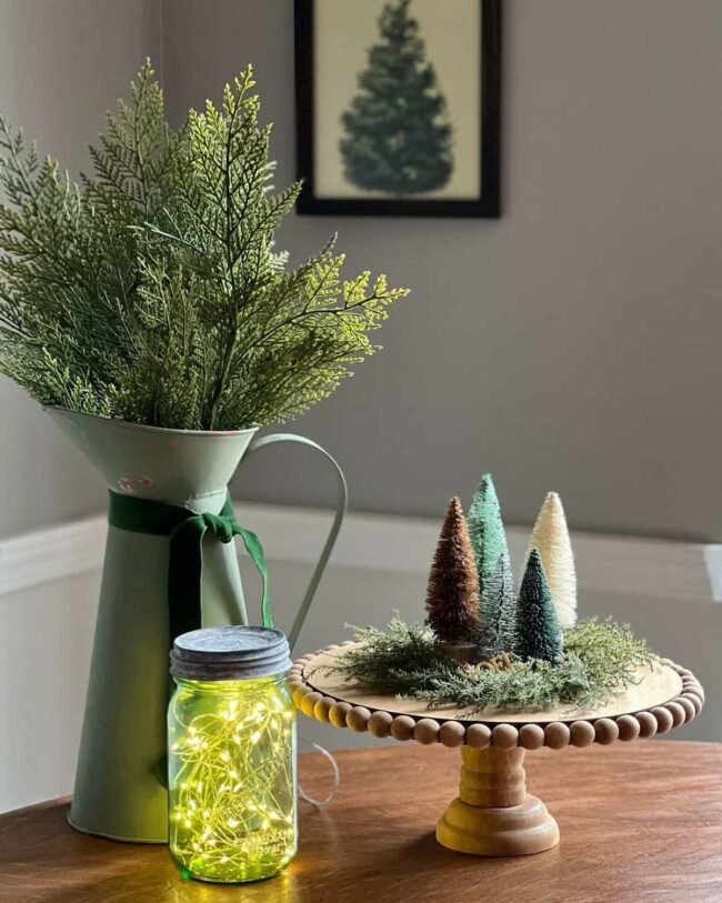 Rustic holiday decor comes alive with a charming antique pitcher overflowing with fresh fir boughs that instantly draw attention.