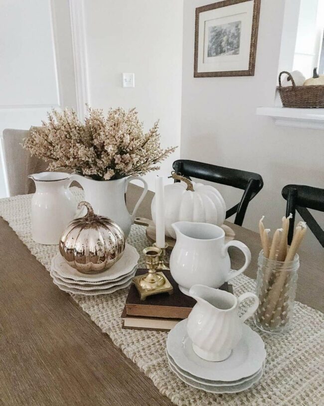 Fall centerpieces radiate warmth and comfort, capturing the season's essence with white ceramic dishes nestled on a knitted table runner.