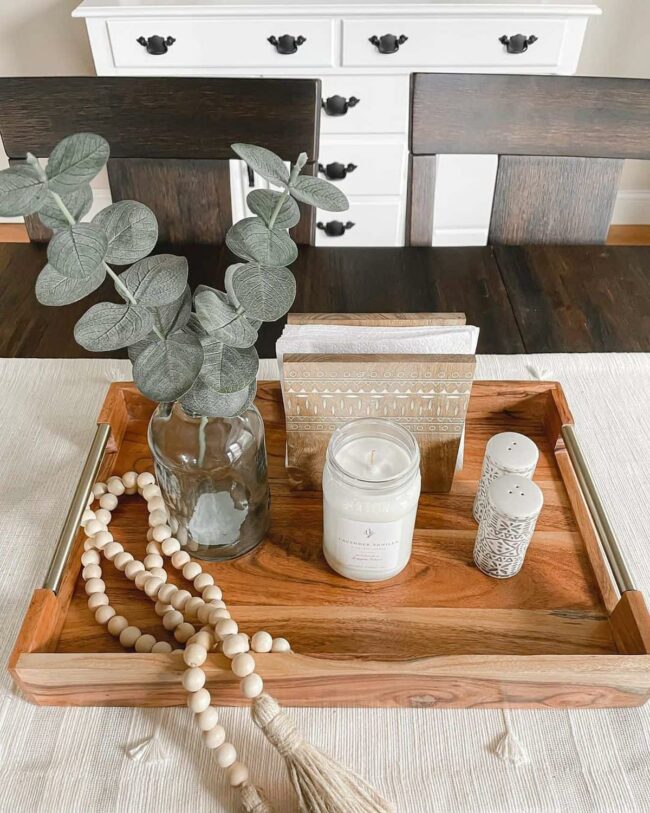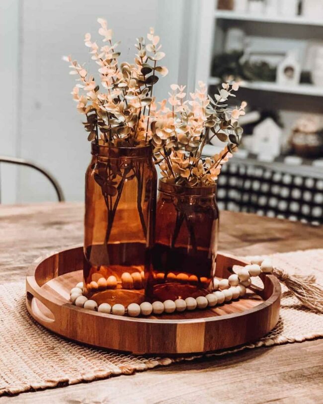 Three vintage mason jars sit elegantly on a round wood platter, adding depth and warmth to the room's carefully curated design.