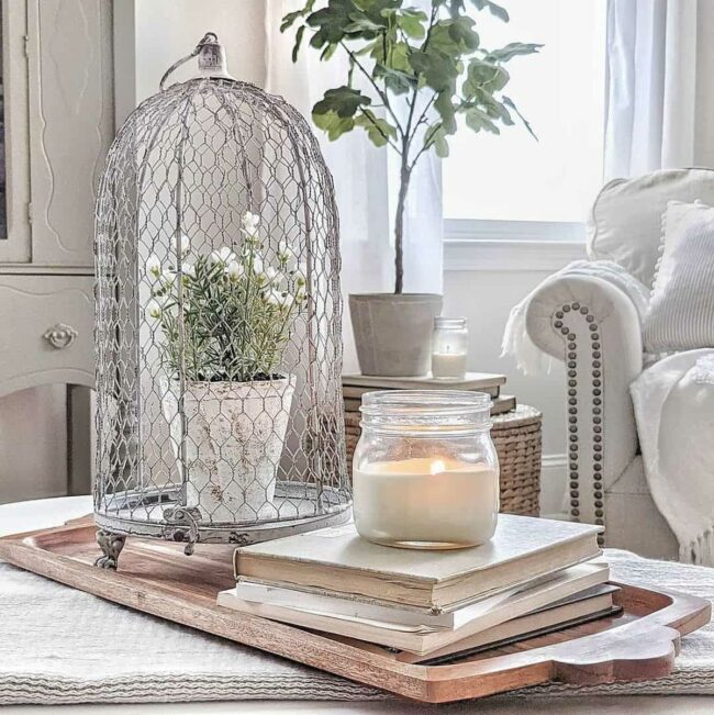 Delicate white flowers nestled in a wire cage bring an elegant touch to the space.