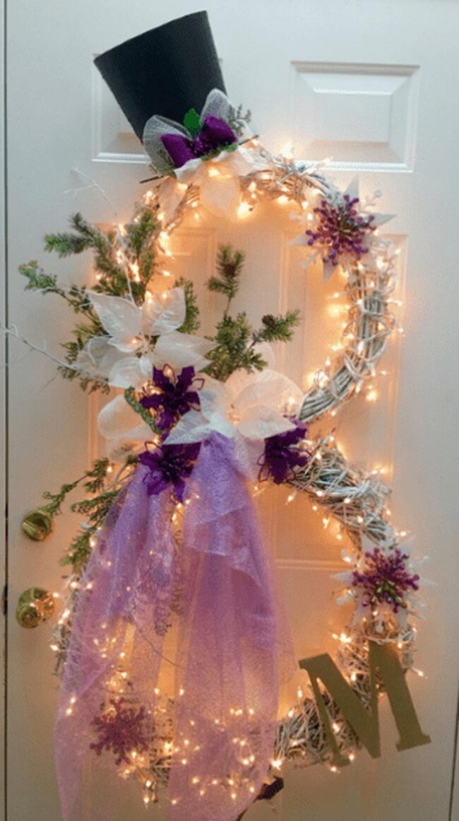 Snowman door decorations burst with personality, drawing everyone's eye with charming black top hats and soft white lights that wrap around their delightful figures.