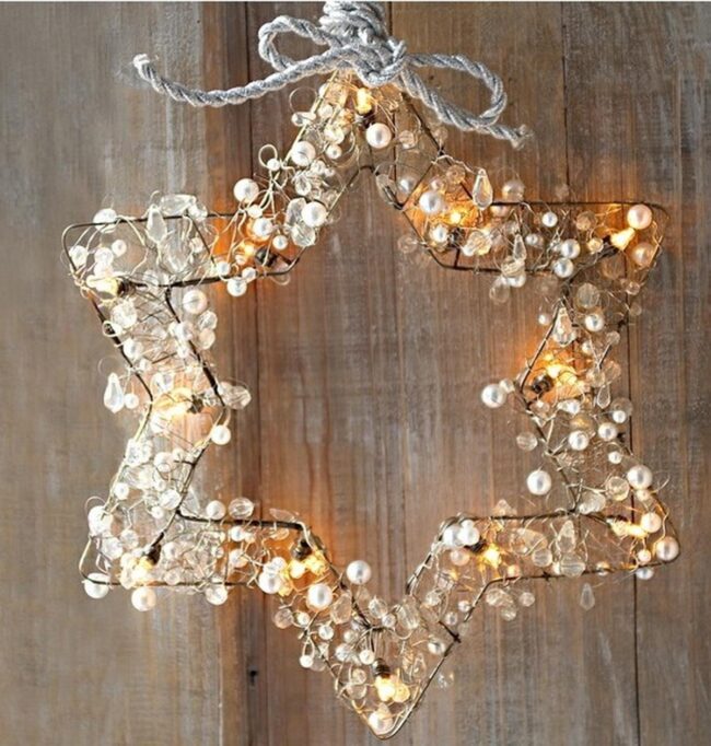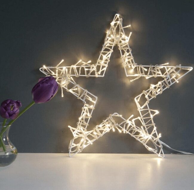Soft twinkle lights peeking through the string design add a gentle radiance that catches every eye, while a delightful yellow star crowns the piece with sparkling elegance.