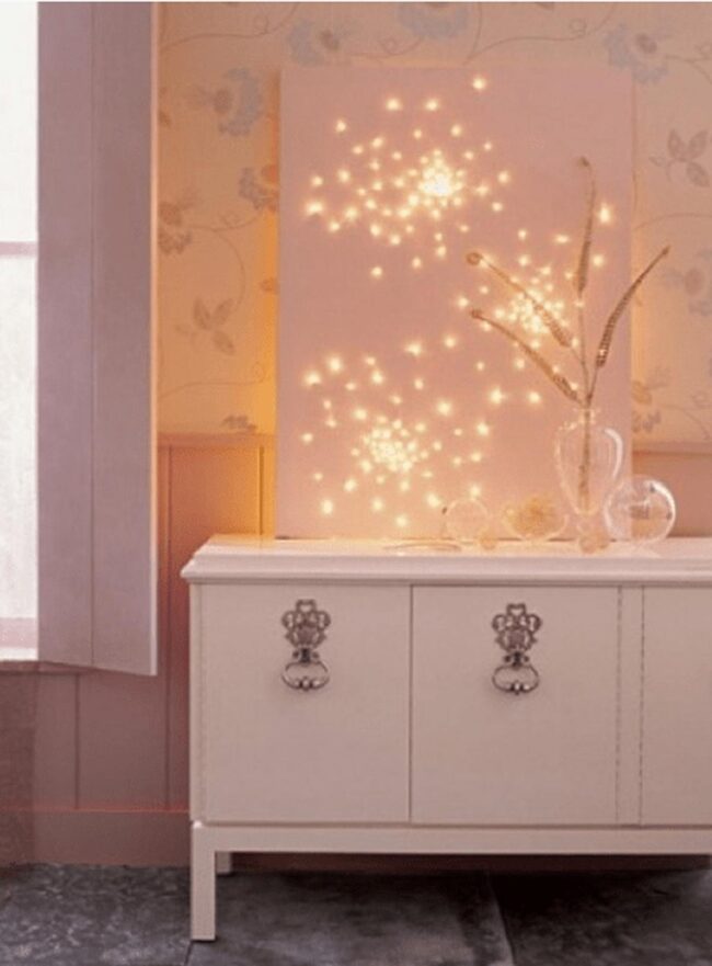 Soft string lights draped elegantly across white curtains add a magical touch that makes your space feel dreamy and personal.