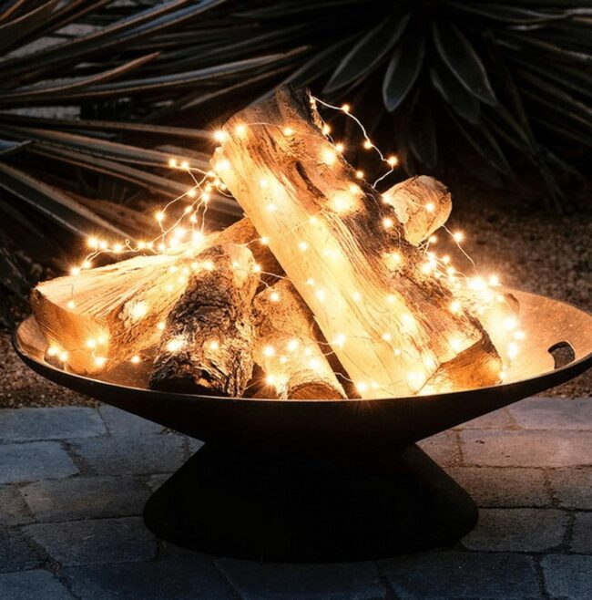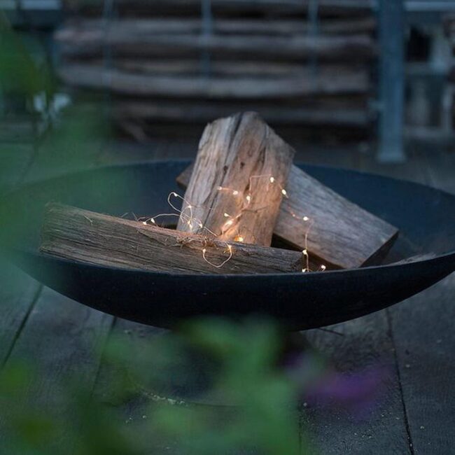 Metal frames encircle carefully stacked firewood, inviting friends and family to share stories under starlit skies.