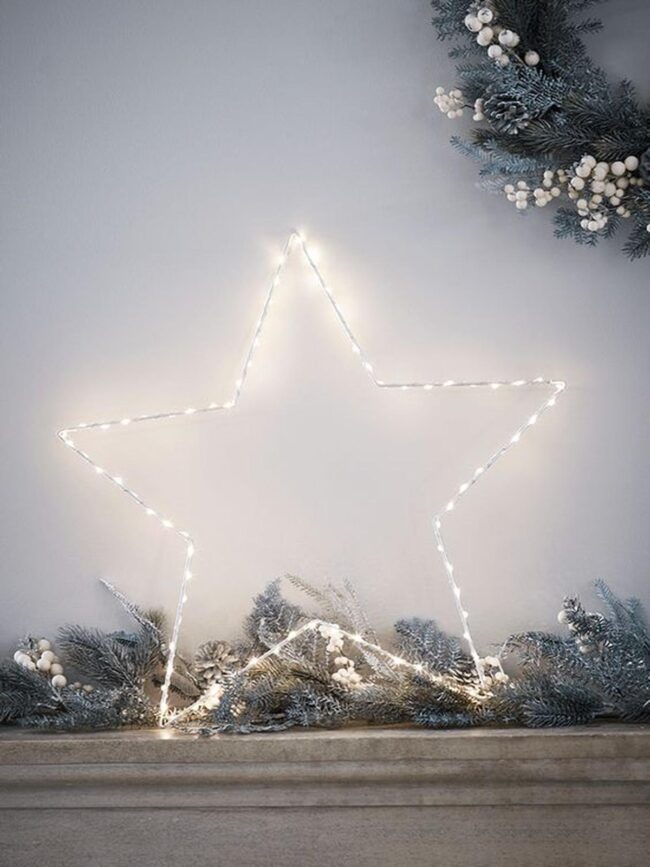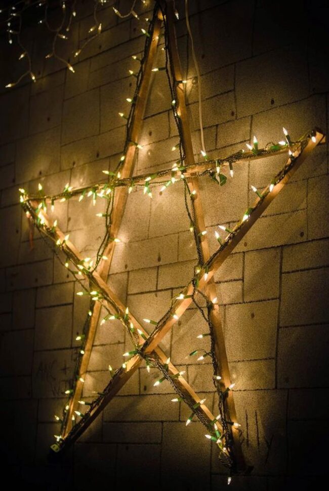 Wooden star decorations shine with enchanting magic, bringing life to blank walls through soft white string lights that dance around delicate green leaves.