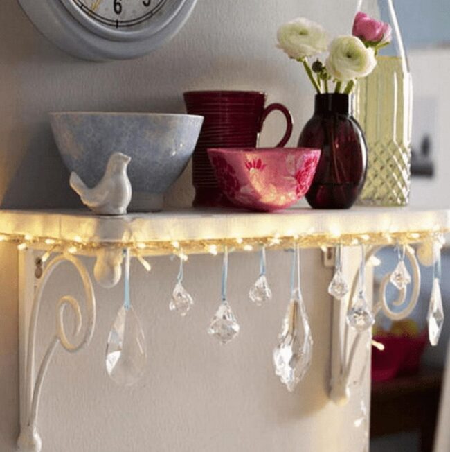 Soft golden string lights weave between displayed treasures, adjusting an ordinary shelf into an enchanting focal point that draws everyone's gaze.