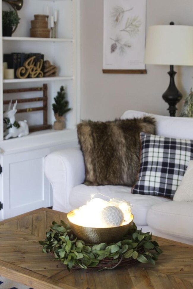 Wooden accents blend beautifully with soft whites, creating harmony that feels both comfortable and festive.