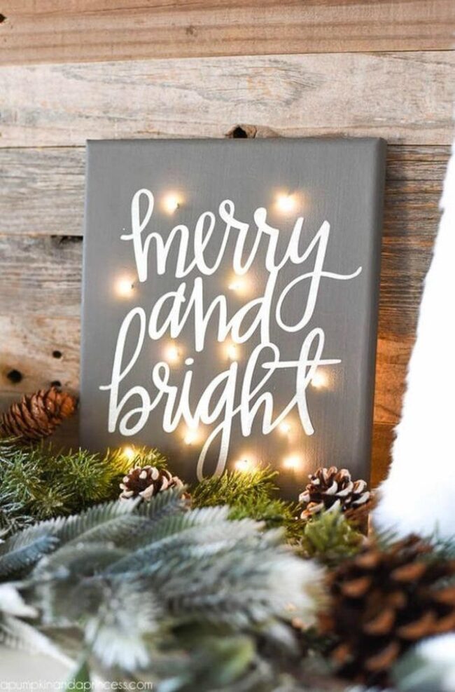 Holiday magic sparkles through a charming "merry and bright" sign, where tiny lights dance between wooden planks, creating an inviting scene that pulls you into the festive spirit.