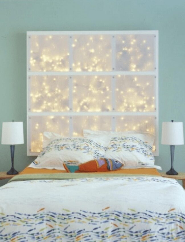 Your bedroom becomes a personal sanctuary with magical star-like lights sparkling behind an intriguing grid headboard, casting enchantment across soft green walls.