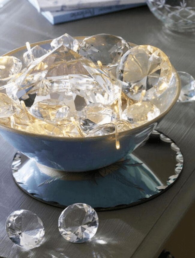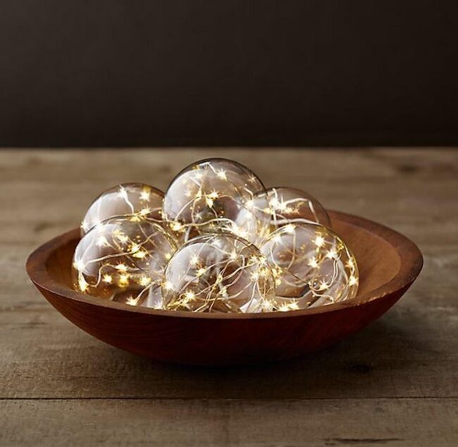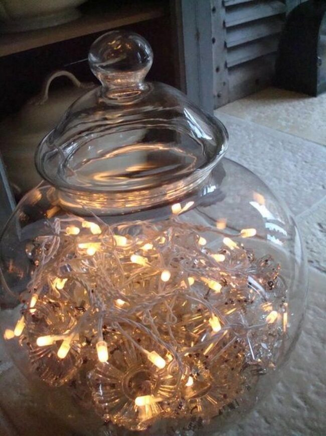 Delicate tiny bulbs dance and twinkle within their glass sanctuary, casting mesmerizing shadows across the room.