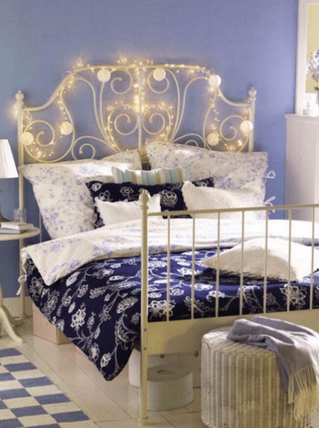 Soft blue walls instantly transport you to a peaceful sanctuary, where delicate twinkle lights dance around a graceful metal bed frame with elegant swirls.