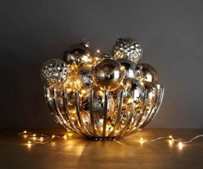 Sparkling silver Christmas ornaments burst with holiday magic inside a metal bowl, creating a mesmerizing display that instantly mirrors attention.